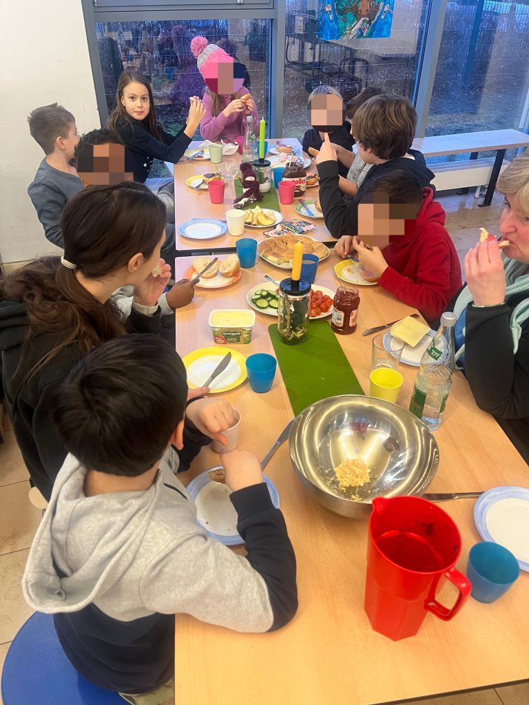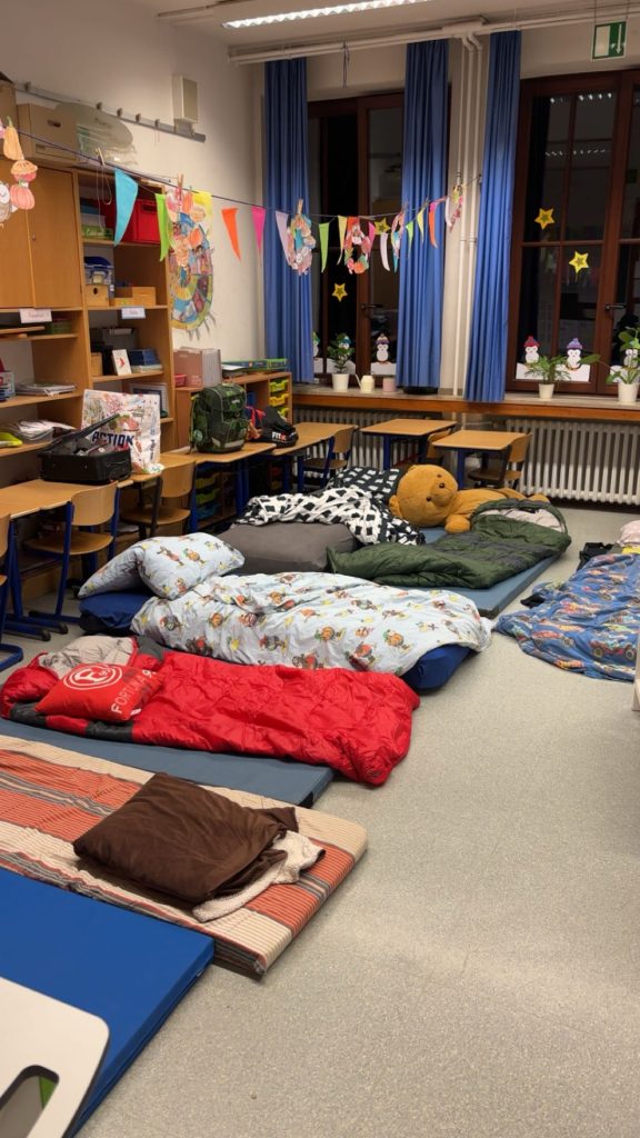 Abends standen gemeinsames Pizzabacken, Verstecken im Schulgebäude, spannende Spiele und Vorlesen auf dem Programm. Den Abschluss des Abends bildete ein gemütlicher Kino-Abend, bei dem die Kinder den Film „Die Olchis – Willkommen in Schmuddelfing“ anschauten. Popcorn und Co. durfte dabei natürlich nicht fehlen. Am nächsten Morgen trafen sich die Kinder in der Aula zu einem gemeinsamen Frühstück, um gestärkt in den Tag zu starten. Die Übernachtung war ein tolles Erlebnis, das die Vorfreude aller auf die Klassenfahrt steigerte. 🧸